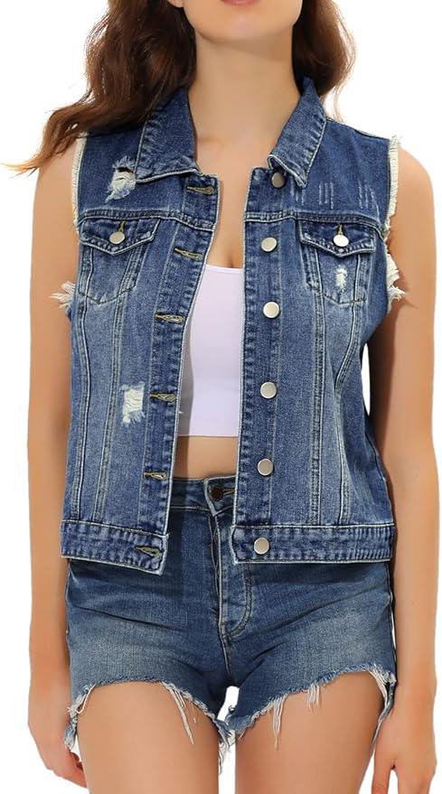 Women's Turn Down Collar Button Closure Sleeveless Washed Distressed Denim Vest