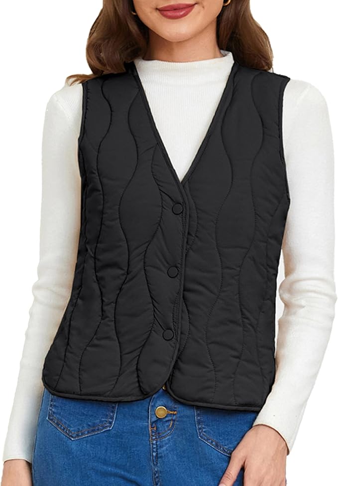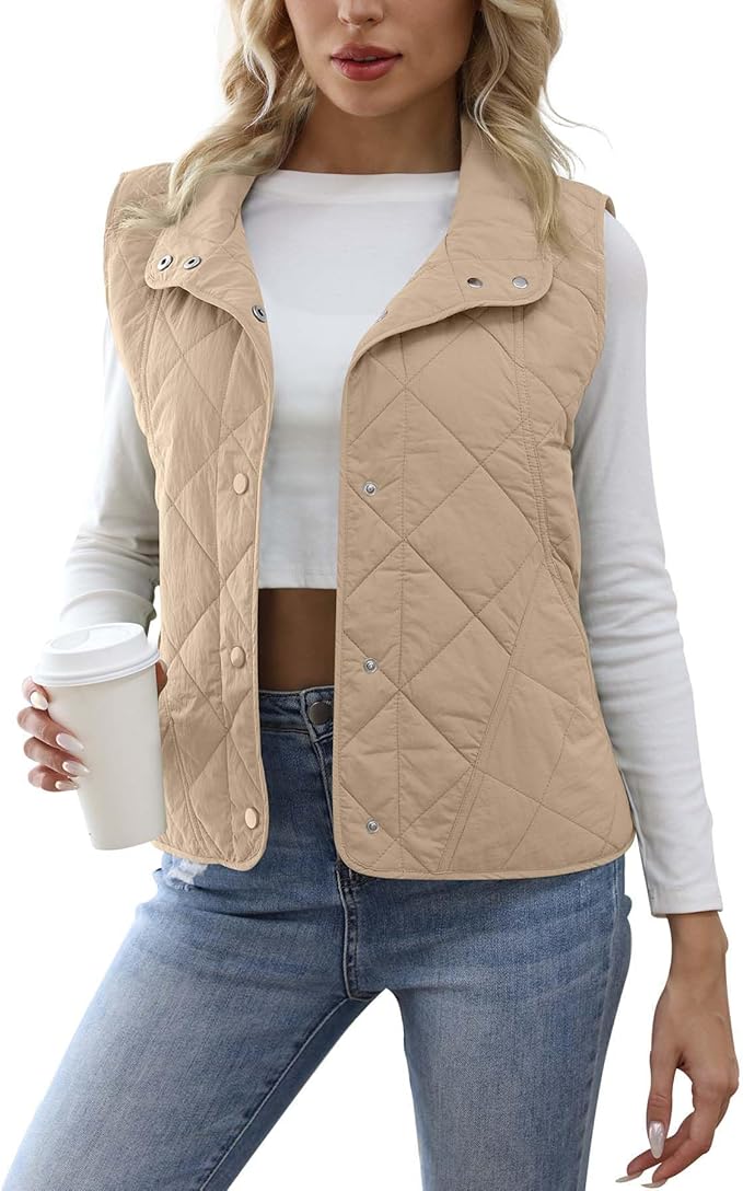 Womens Quilted Vest Lightweight Sleevesless Stand Collar Button Down Padded Gilet Fall Outerwear Vests with Pockets