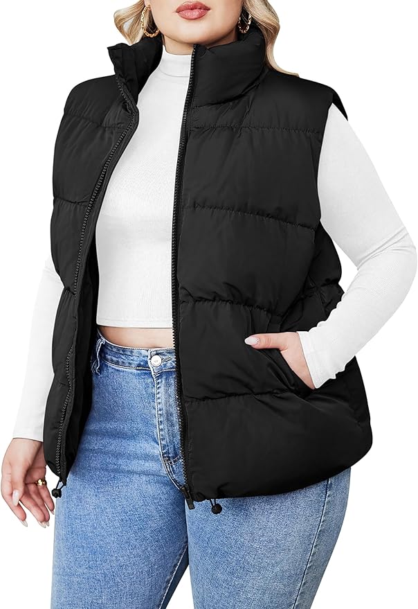 Women's Plus Size Zip Up Puffer Vest Stand Collar Outerwear Sleeveless Padded Jacket Coat with Pockets