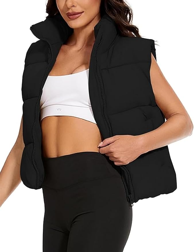 Women's Puffer Vest Cropped Sleeveless Winter Outerwear Lightweight Stand-up Collar Down Vest with Pockets
